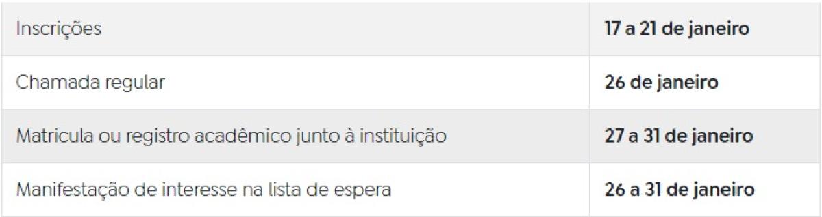 De acordo com o edital publicado pelo Ministério da Educação, o processo seletivo será constituído de uma única etapa. Os candidatos poderão se inscrever em até duas opções de vagas. O resultado da chamada regular será divulgado dia 26 de janeiro, no Portal Único de Acesso.