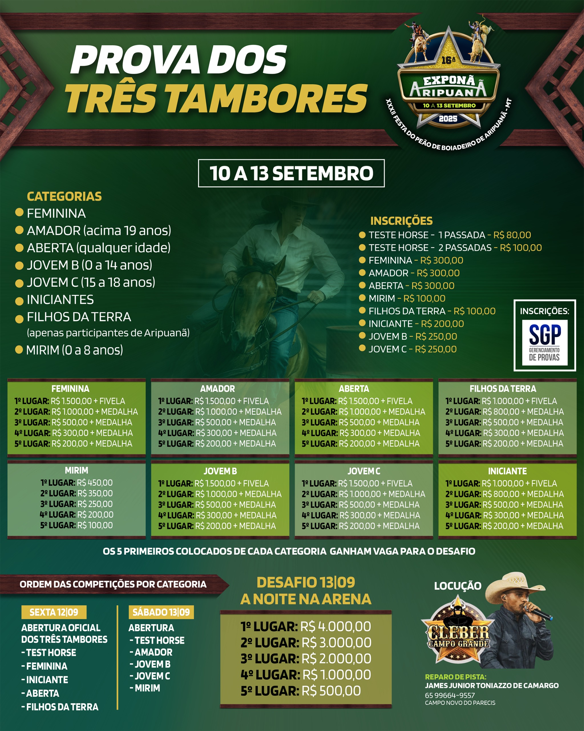 Entre as competições mais aguardadas está a Prova dos Três Tambores, que reunirá competidores de diversas idades e categorias. Os vencedores disputarão prêmios que ultrapassam R$ 30 mil, além de troféus, medalhas e fivelas personalizadas.