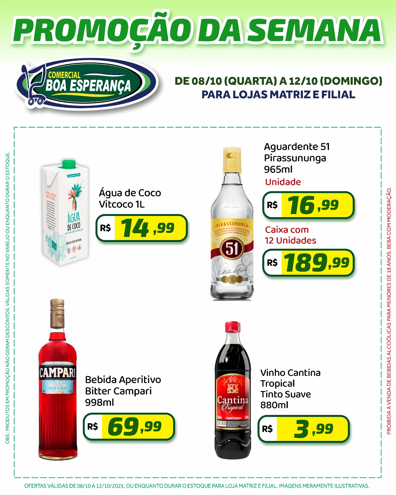 Bebidas como Campari 998ml e Vinho Cantina Suave 880ml