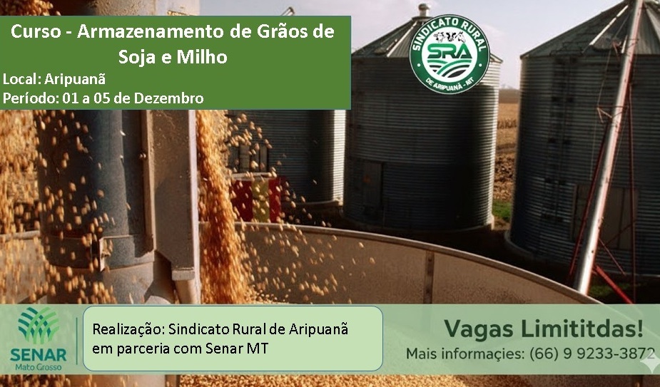 Já o Curso de Armazenamento de Grãos de Soja e Milho ocorrerá entre 1º e 5 de dezembro, também no município. Os participantes aprenderão técnicas de manejo pós-colheita, identificação de pragas, controle de umidade, conservação e procedimentos adequados para manter a qualidade dos grãos durante todas as etapas de armazenamento.
