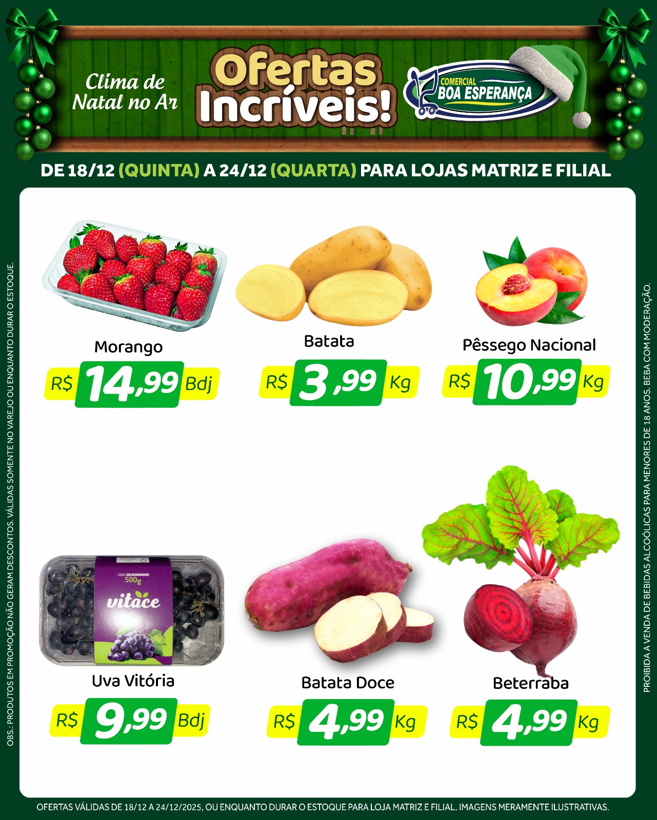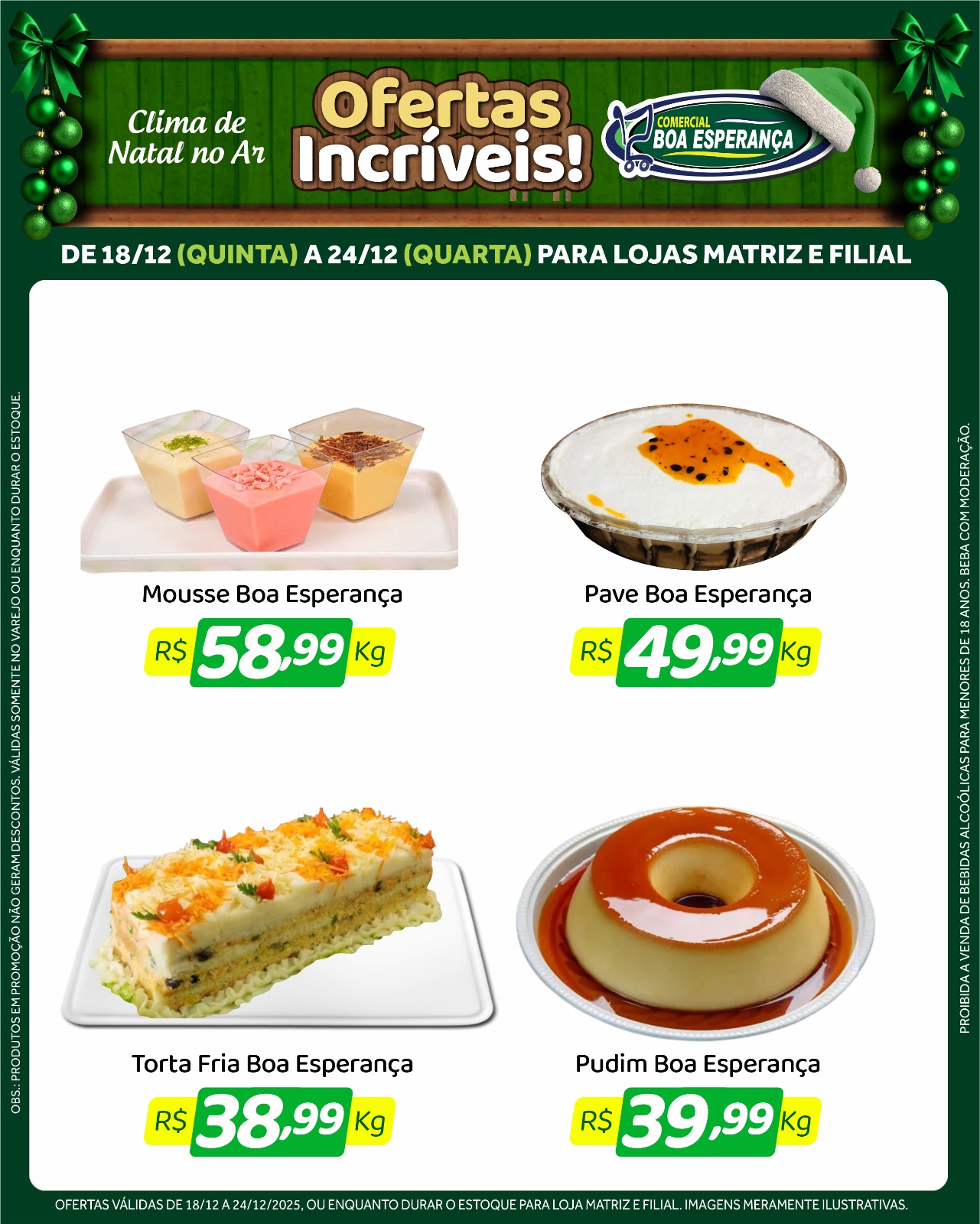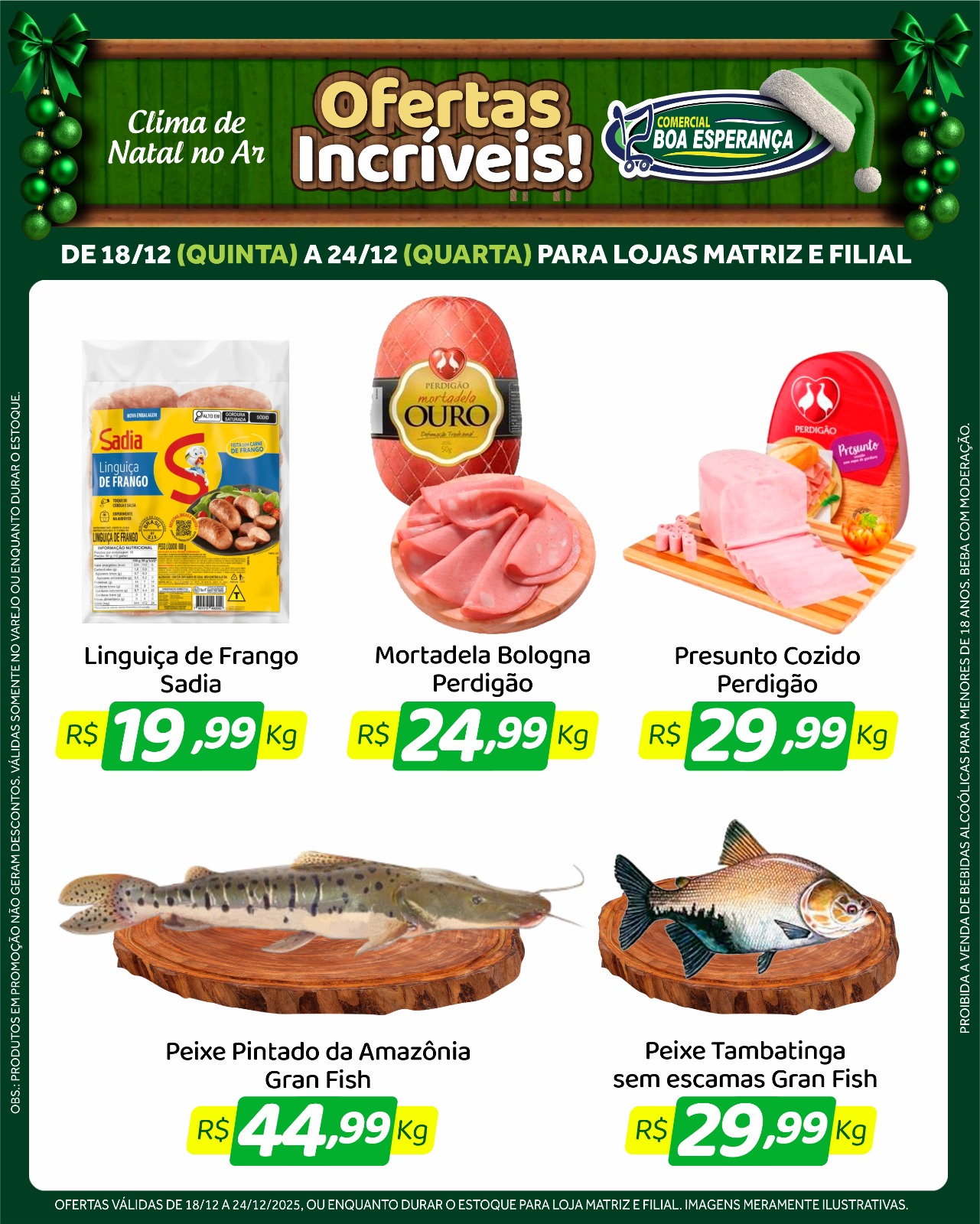 Os setores de padaria e açougue recebem atenção especial durante a campanha. A padaria do Comercial Boa Esperança produz diariamente pães, bolos, tortas, pavês e pudins fresquinhos, ideais para as ceias e confraternizações. Já o açougue oferece cortes selecionados de paleta e pernil suínos, frango, peixes e carnes bovinas premium, dentro do tradicional Festival de Carnes, realizado de quinta a quarta (24).