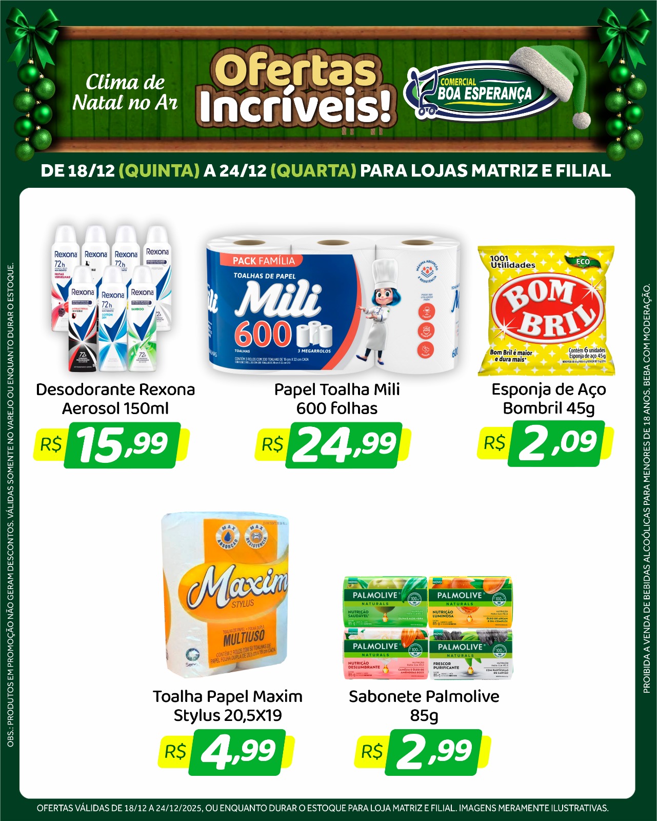 O espírito natalino já tomou conta de Aripuanã e está impulsionando o comércio local. O Comercial Boa Esperança deu início, nesta quinta-feira (18), a mais uma edição da campanha promocional “Clima de Natal no Ar”, oferecendo sete dias consecutivos de descontos especiais nas duas unidades da rede no município. A ação segue até a quarta-feira (24), véspera de Natal, e promete atrair grande público em busca de economia e produtos de qualidade para as confraternizações de fim de ano.