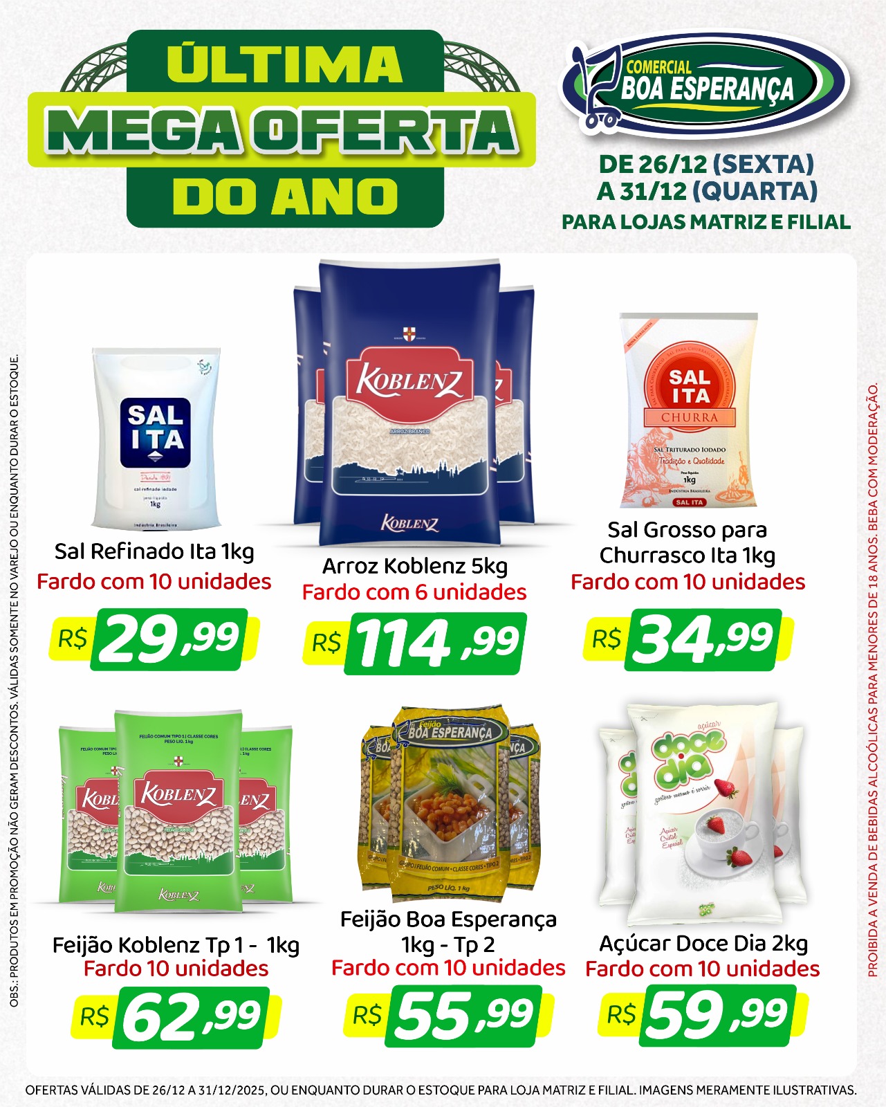 Entre os principais destaques da campanha estão o Arroz Koblenz (fardo de 30 kg), Feijão Koblenz e Boa Esperança (10 kg), Açúcar Doce Dia (fardo com 10 pacotes de 2 kg), Sal refinado e grosso Ita (fardo de 10 kg) e Farinha de Trigo Alvalade (10 x 1 kg). A promoção inclui ainda kits de Chester e Peru, além de bebidas como Vinho Aurora Moscatel, Espumante Moscatel sem álcool, Campari e uma ampla variedade de whiskies nacionais e importados.