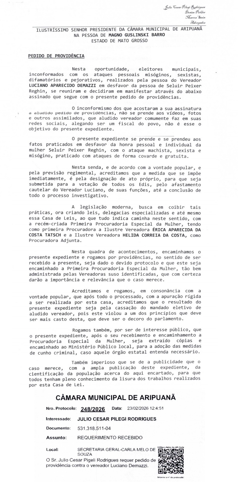 O pedido foi protocolado sob o nº 248/2026, na Câmara Municipal de Aripuanã, tendo como interessado o escritório de advocacia Julio Cesar Pilegi Rodrigues. Os signatários ainda pedem ampla publicidade do expediente para conhecimento da população.
