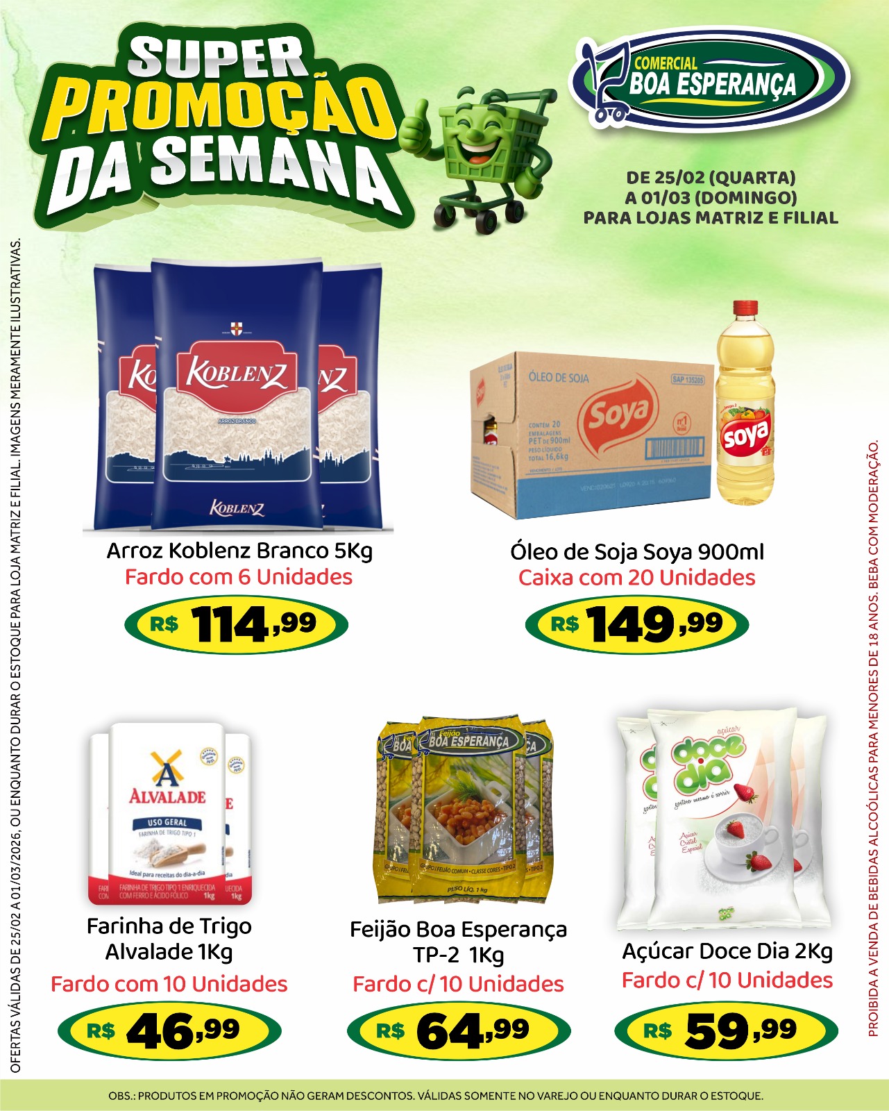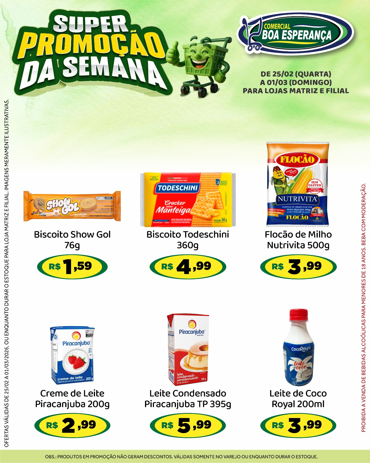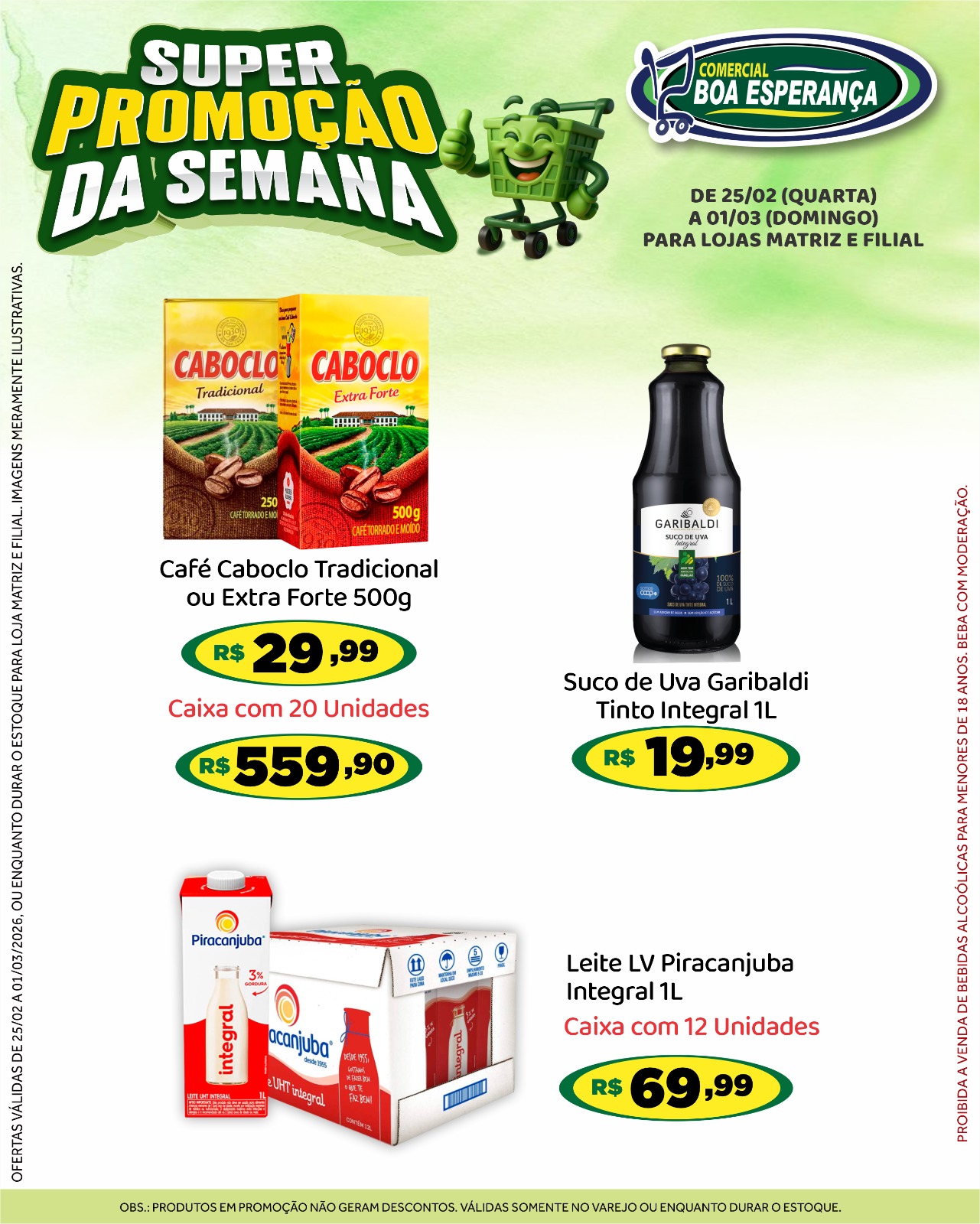 Os consumidores de Aripuanã e região já podem se preparar para economizar nas compras do dia a dia. O Comercial Boa Esperança iniciou nesta quarta-feira (25) a campanha “Super Promoção da Semana”, válida até o próximo domingo, 1º de março, com dezenas de produtos em oferta nas duas unidades da rede no município.