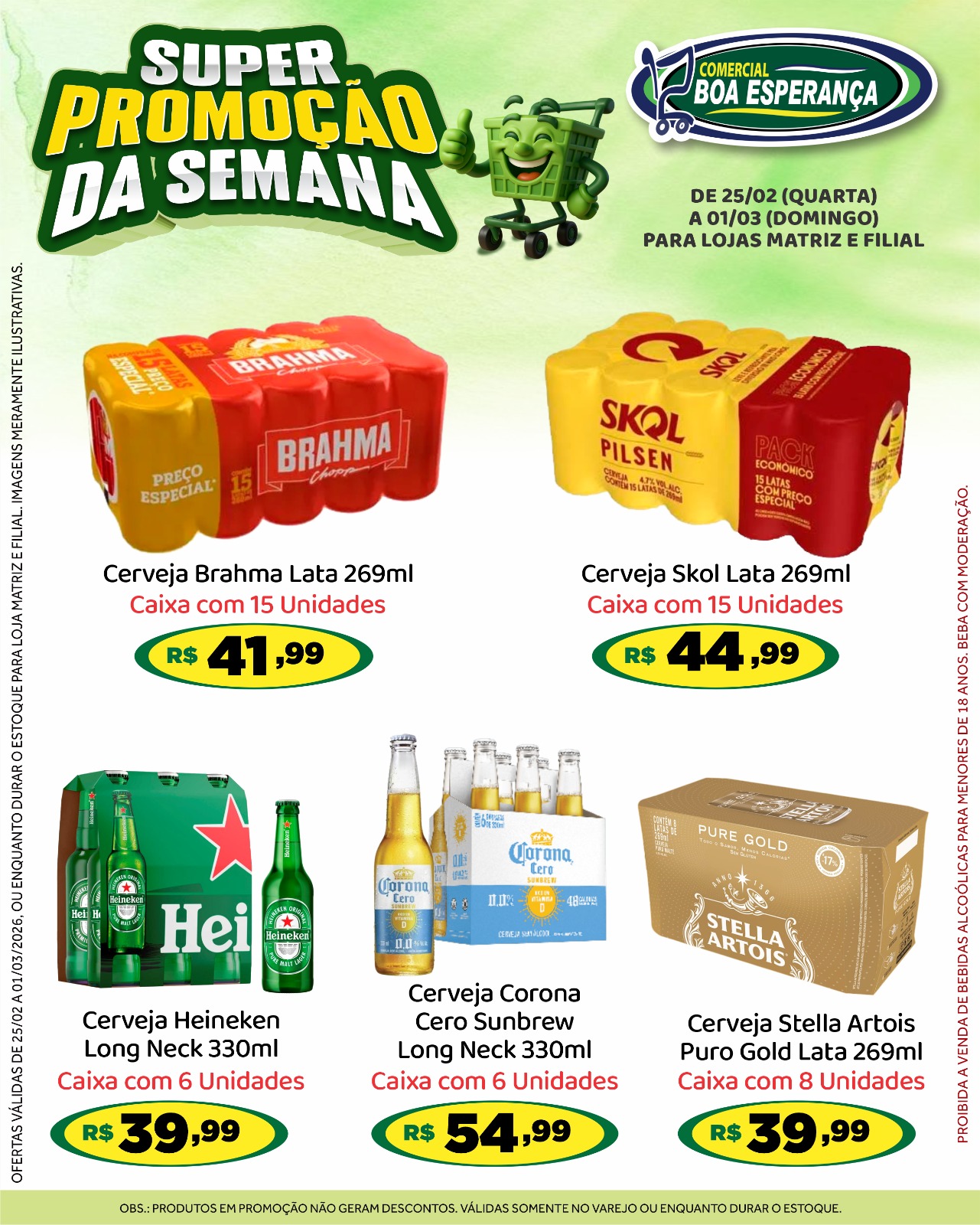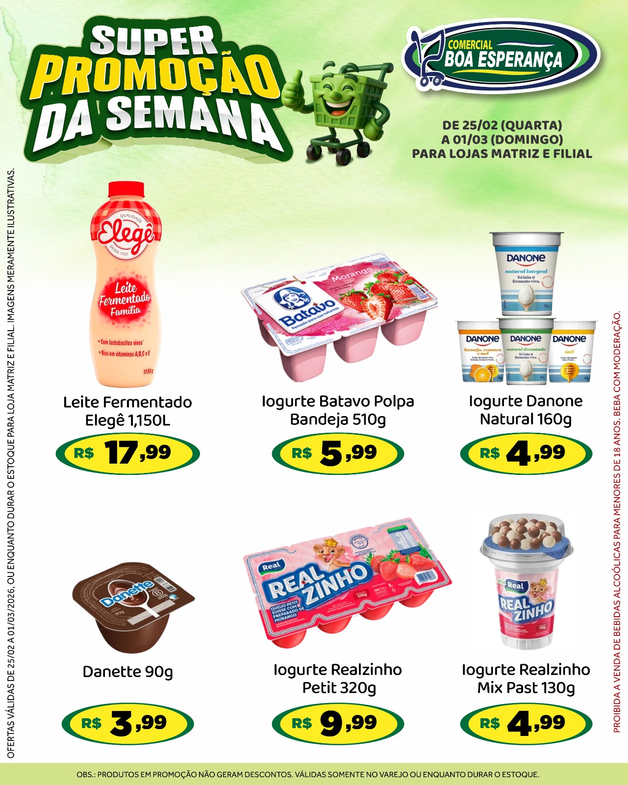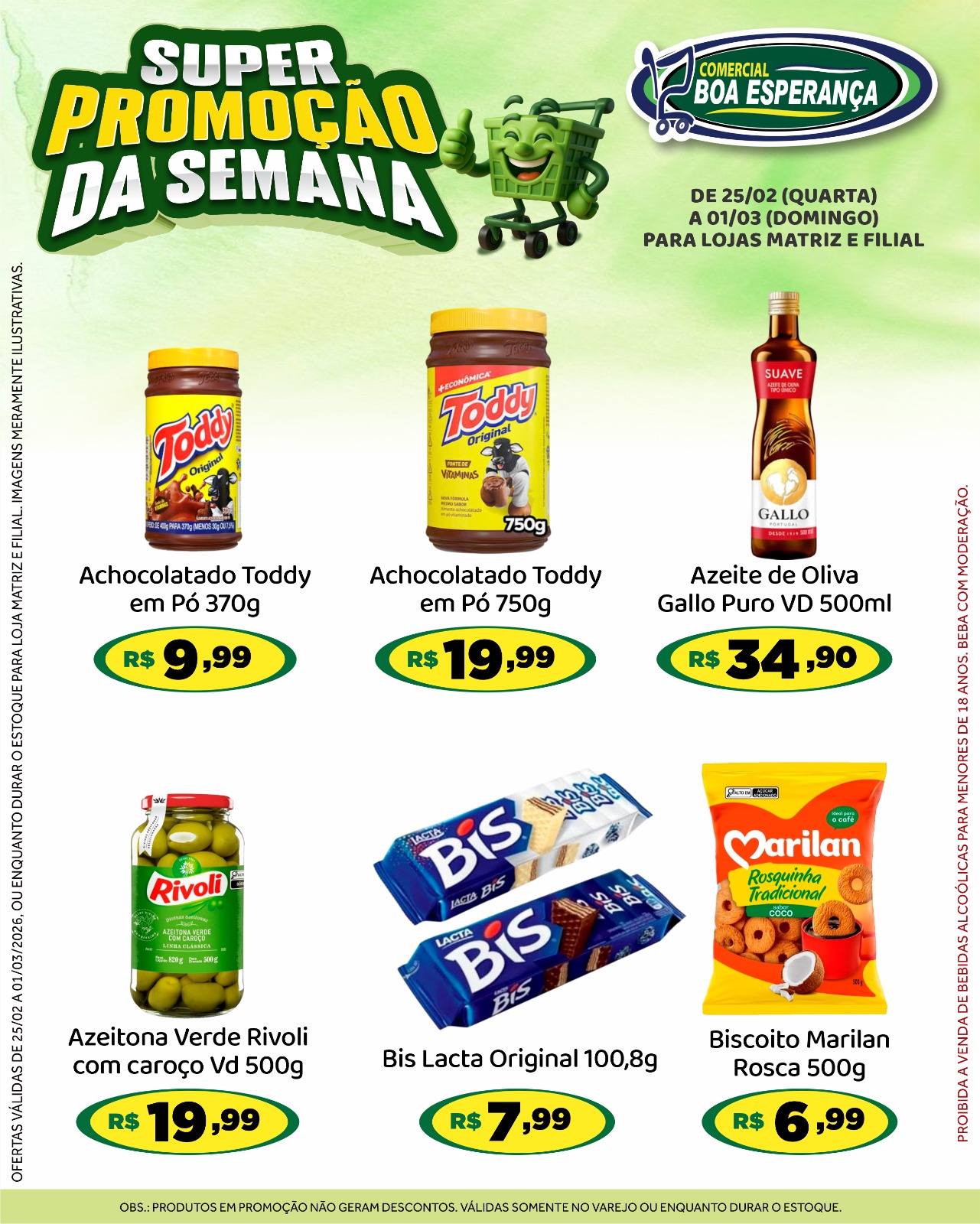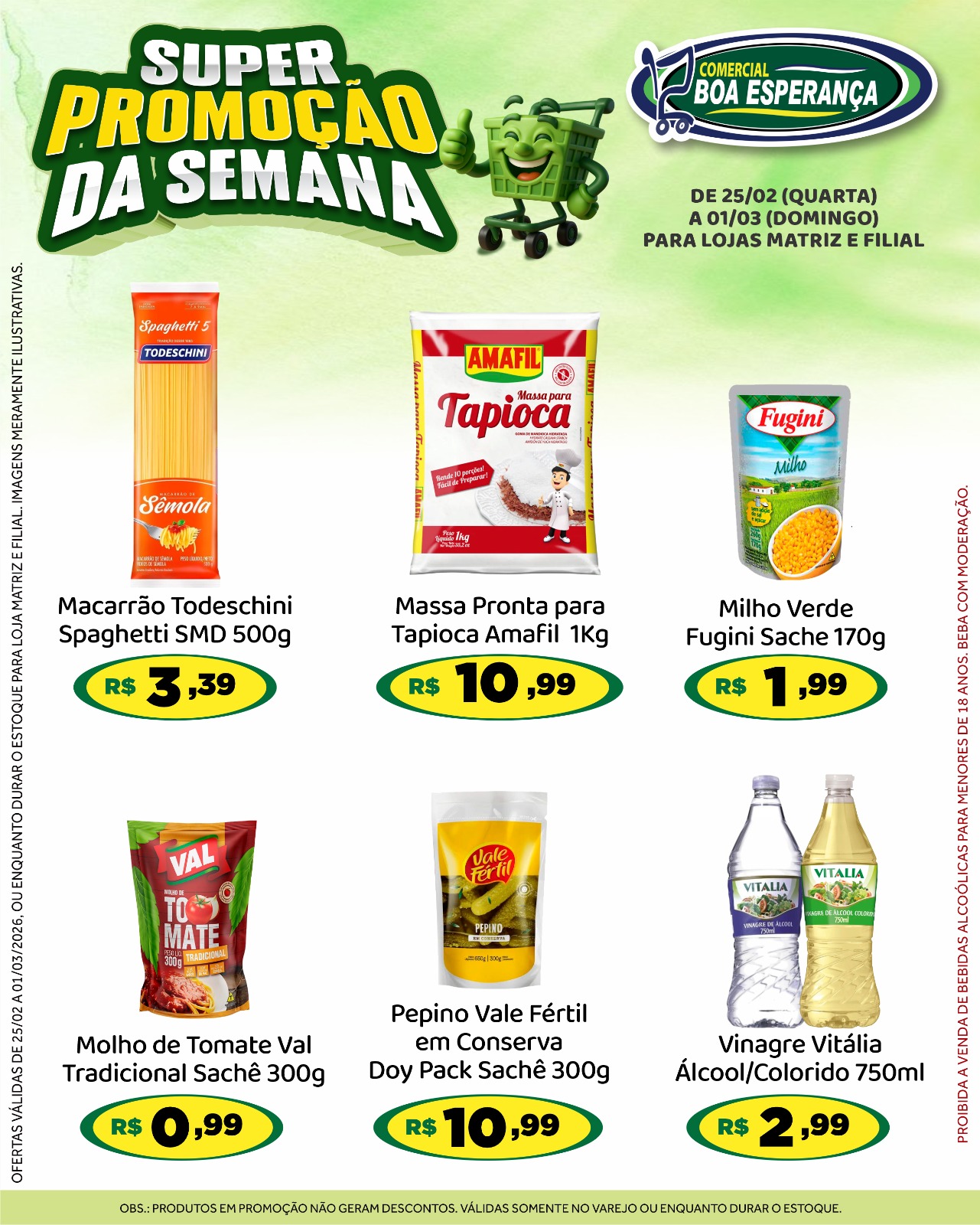 Os consumidores de Aripuanã e região já podem se preparar para economizar nas compras do dia a dia. O Comercial Boa Esperança iniciou nesta quarta-feira (25) a campanha “Super Promoção da Semana”, válida até o próximo domingo, 1º de março, com dezenas de produtos em oferta nas duas unidades da rede no município.
