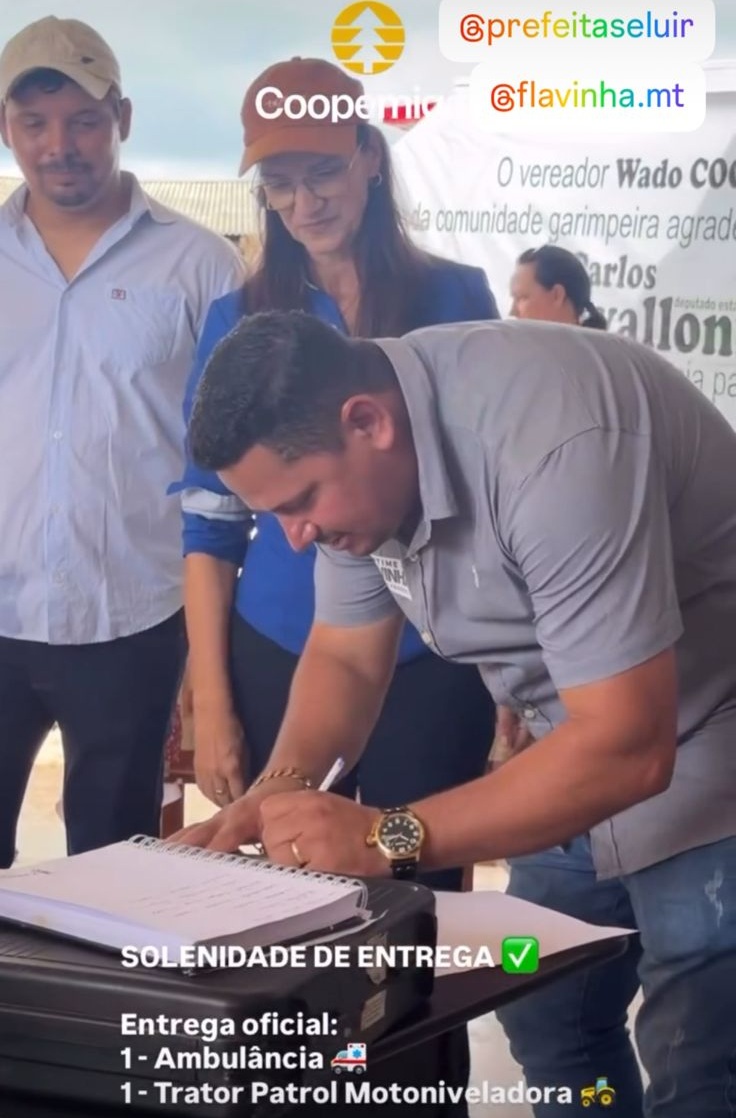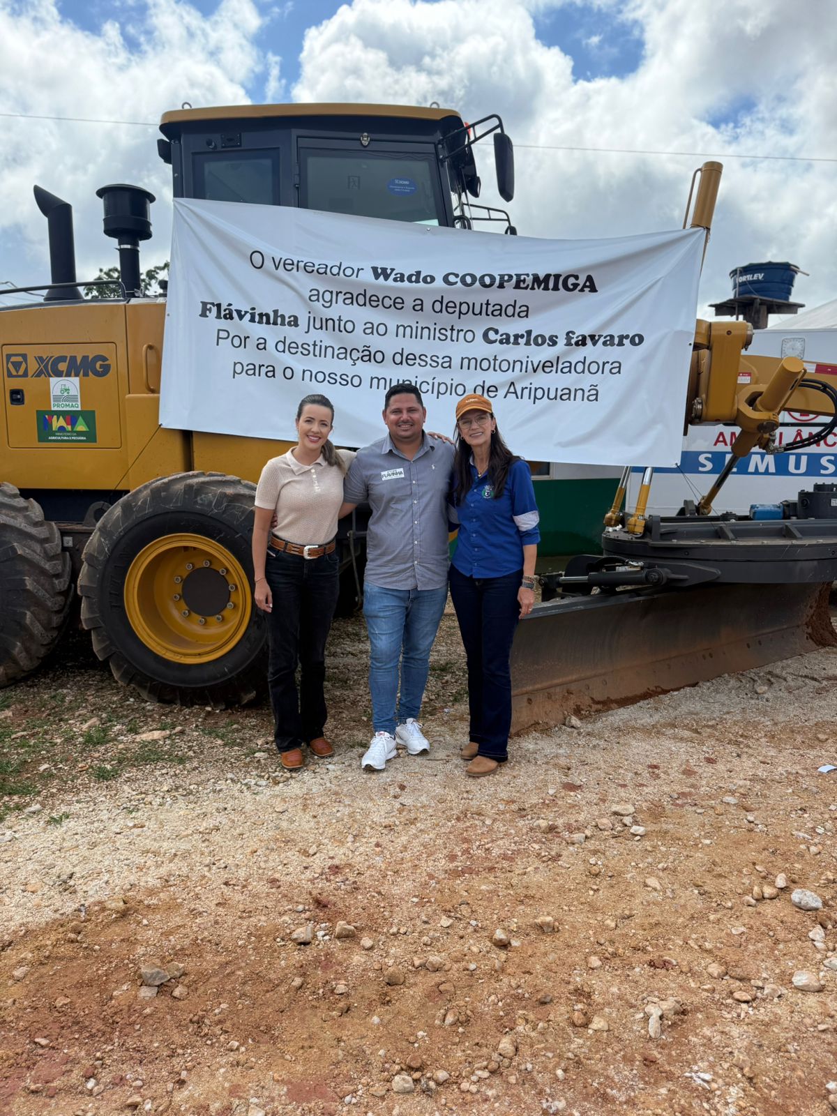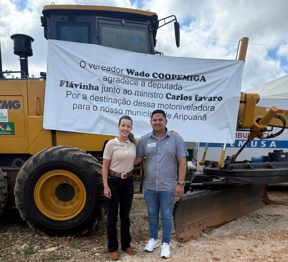 O presidente da Câmara Municipal de Aripuanã, vereador Magno Guslinski Barro (Wado Coopemiga), participou no último sábado (28) da entrega de uma motoniveladora à Associação AGRA, em parceria com a Cooperativa COOPEMIGA. O equipamento foi adquirido com recursos do Governo Federal, viabilizados por meio de articulação da deputada federal Flávia Rodrigues (Flavinha) junto ao ministro da Agricultura, Carlos Fávaro.