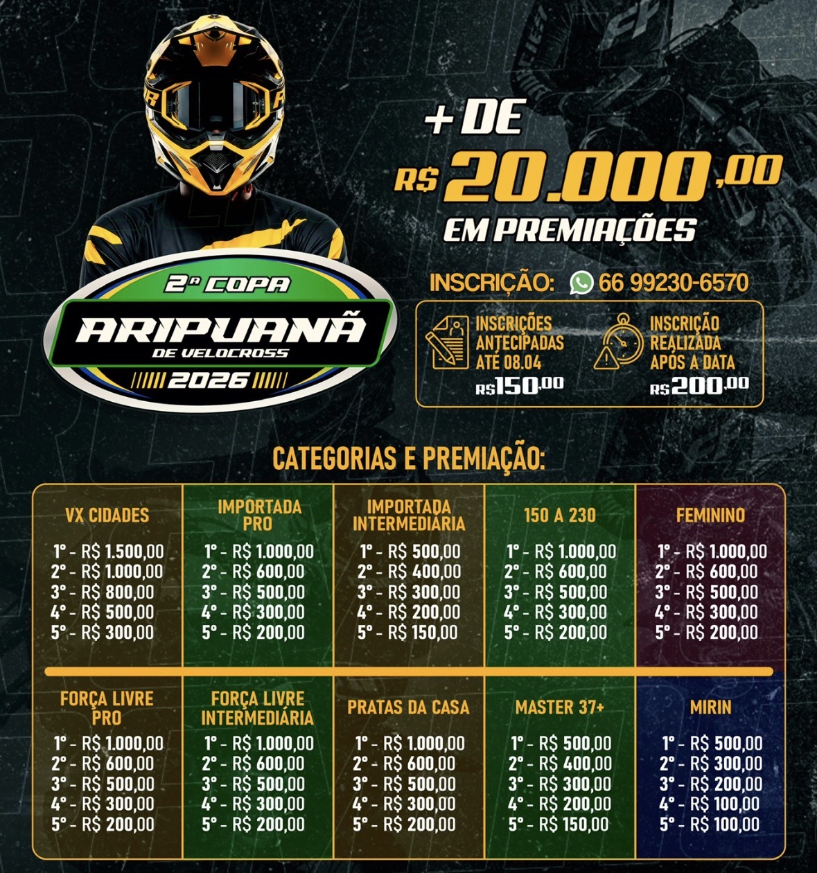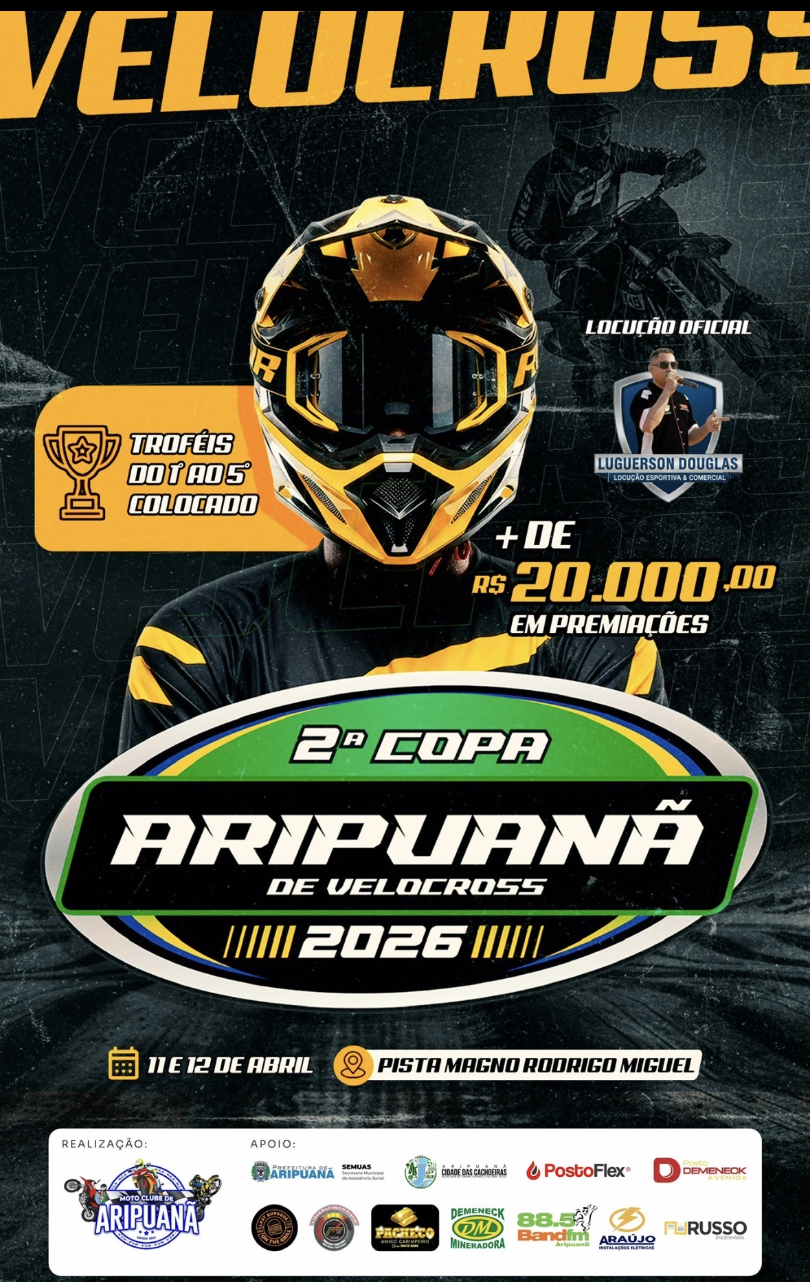 O município de Aripuanã se prepara para receber, nos dias 11 e 12 de abril, a 2ª Copa Aripuanã de Velocross, evento que promete reunir pilotos, equipes e amantes do esporte em um fim de semana marcado por velocidade, adrenalina e integração entre as famílias.