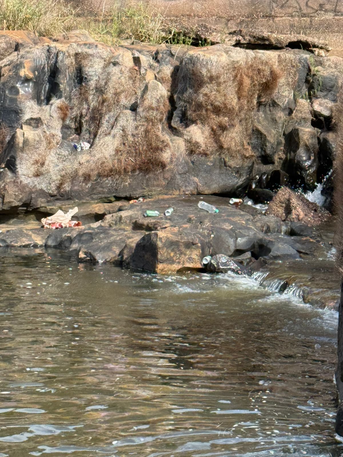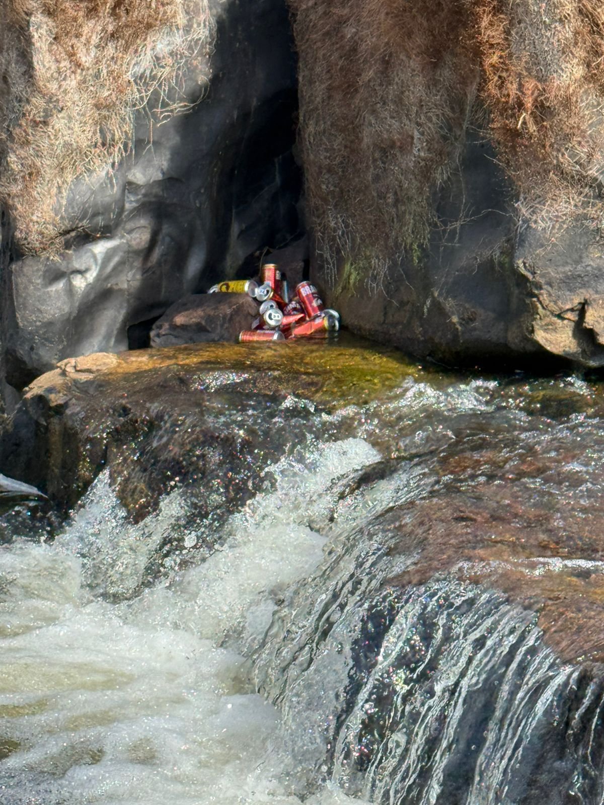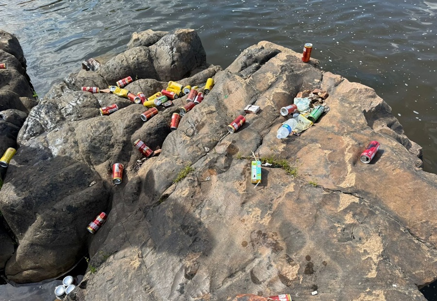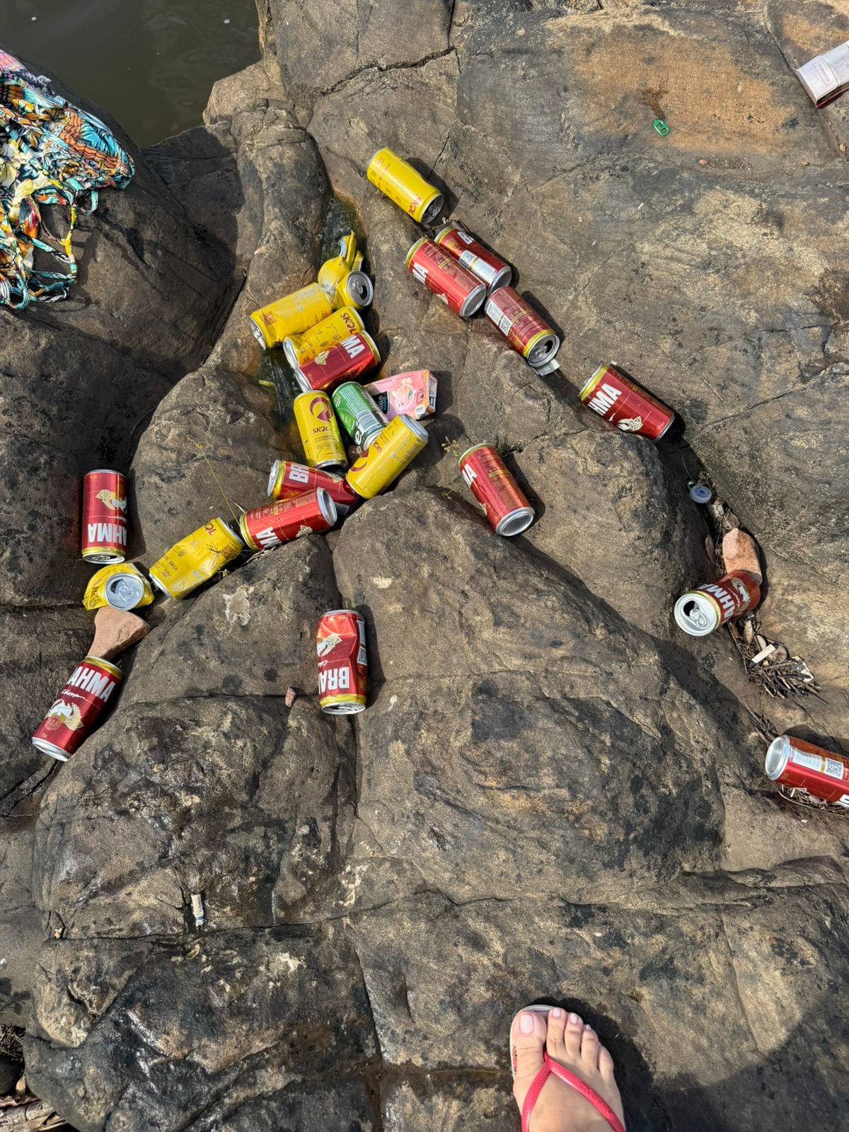 Entre os resíduos encontrados, destacam-se latas de cerveja e outros tipos de lixo deixados sobre as pedras e nas áreas de banho, o que representa não apenas um impacto ambiental significativo, mas também riscos à segurança de frequentadores, especialmente das crianças que aproveitam o espaço nos fins de semana.