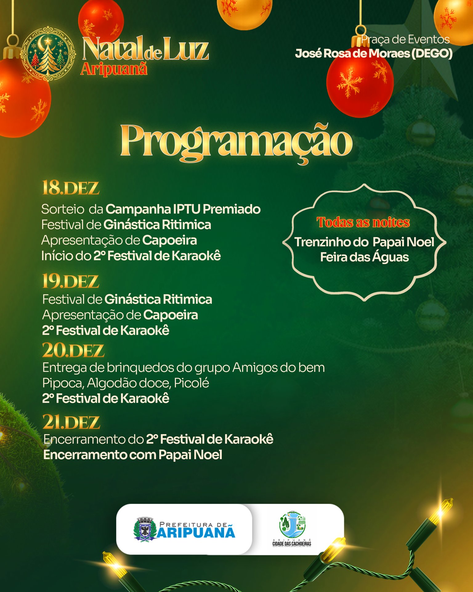 A Prefeitura de Aripuanã, por meio da Secretaria Municipal de Turismo, Esporte e Cultura (SETEC), convida a população para a abertura oficial do Natal de Luz 2025, que será realizada entre os dias 18 e 21 de dezembro, sempre a partir das 19h, na Praça de Eventos José Rosa de Moraes (Dego).