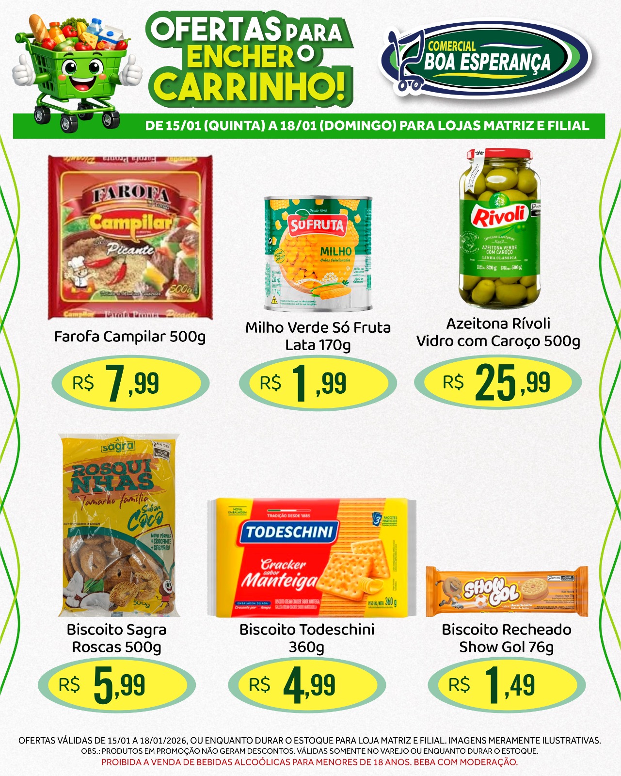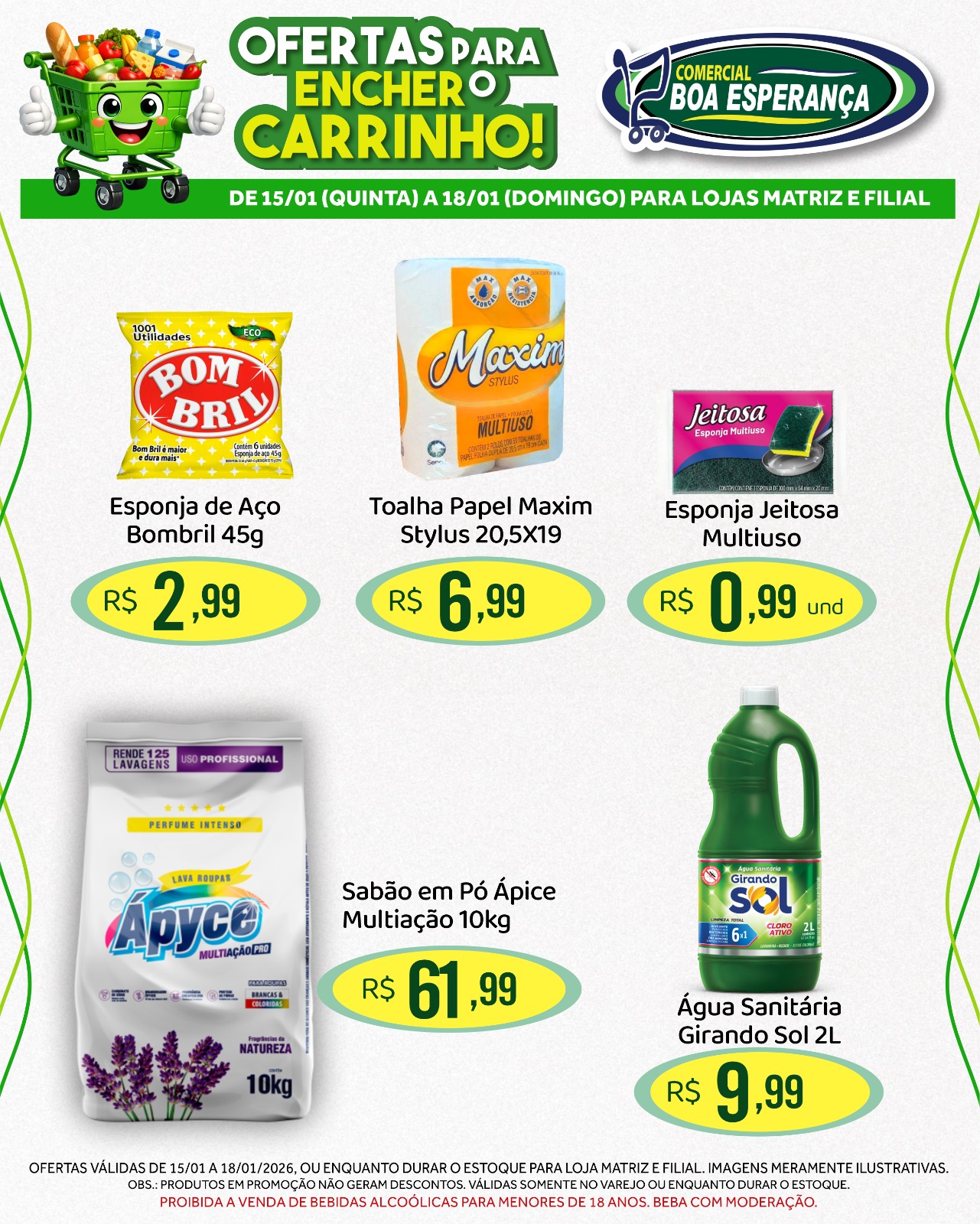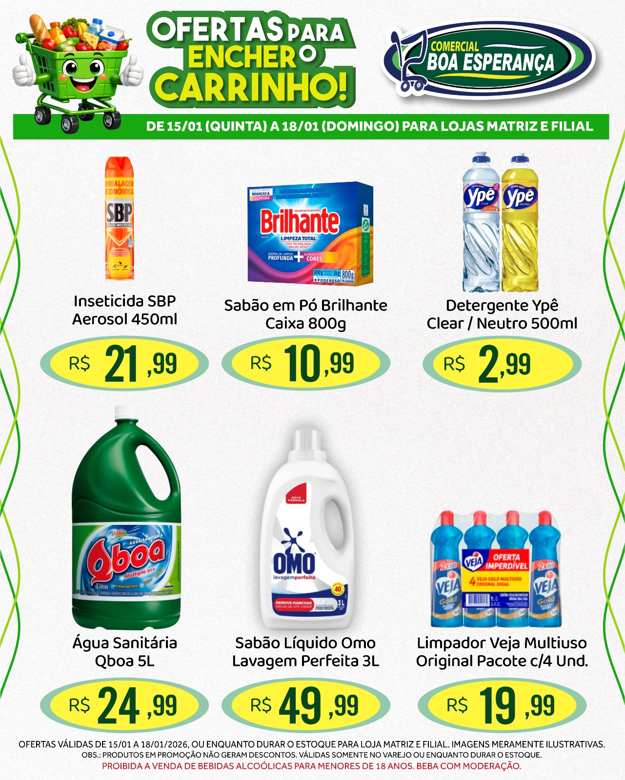 Entre os principais destaques estão: Detergente Ypê 500ml, Sabão em Pó Brilhante 800g, Água Sanitária Qboa 5L, Leite em pó Ninho 380g, Achocolatado Nescau 350g, Macarrão Todeschini 500g, Canjiquinha Pinduca 400g, Biscoito Sagra Roscas 500g, Farofa Campilar 500g, Milho Verde Só Fruta 170g, Tempero Arisco 1kg e Margarina com Sal Delícia 1kg.