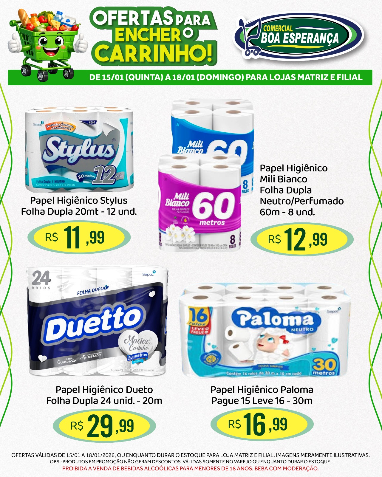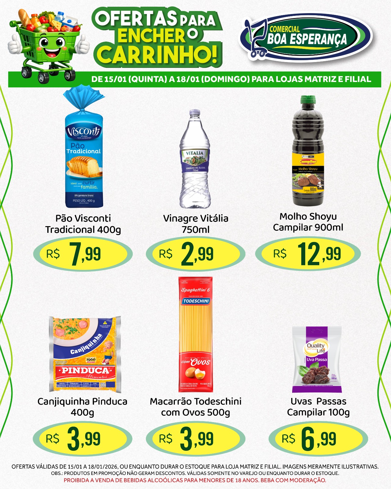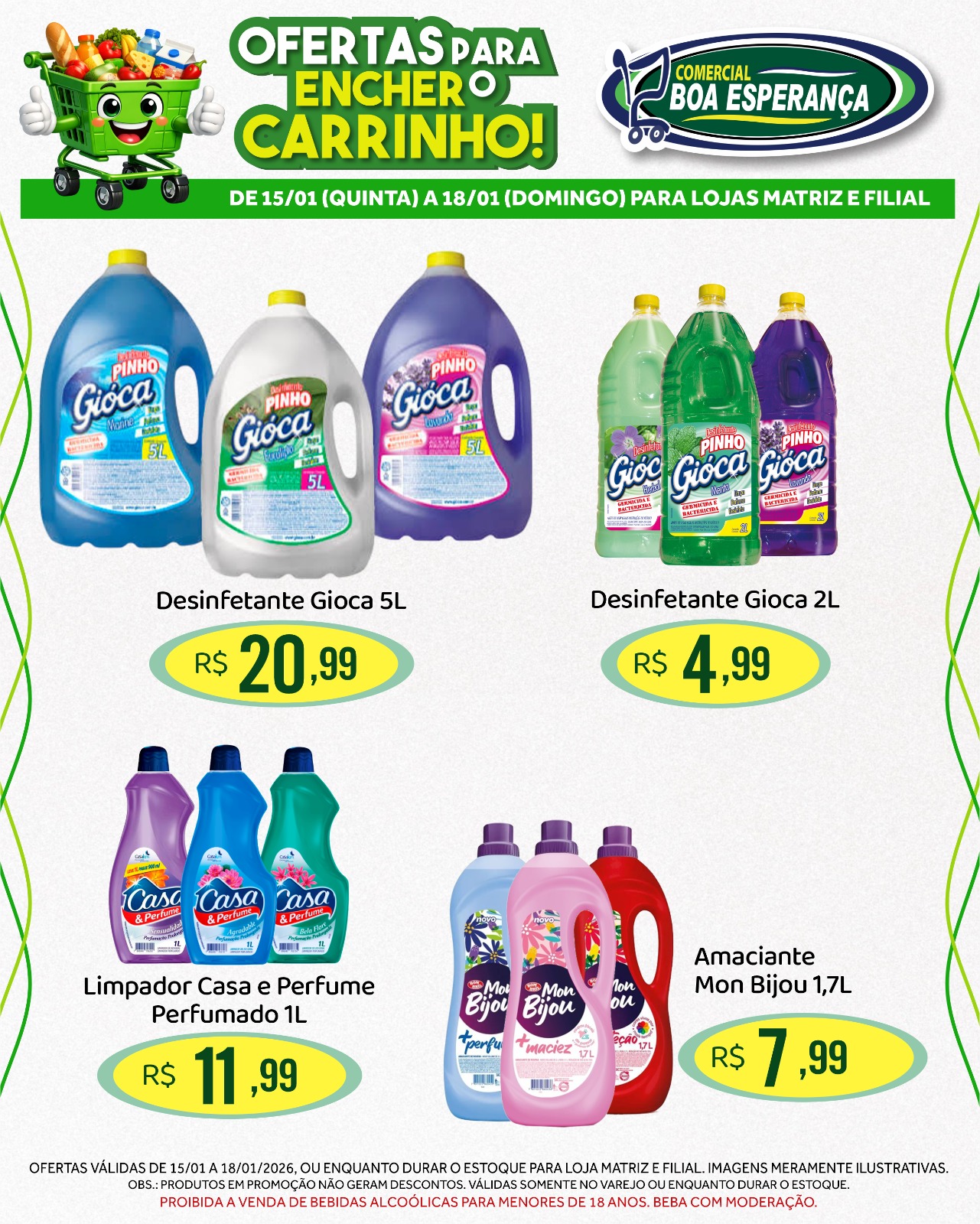Entre os principais destaques estão: Detergente Ypê 500ml, Sabão em Pó Brilhante 800g, Água Sanitária Qboa 5L, Leite em pó Ninho 380g, Achocolatado Nescau 350g, Macarrão Todeschini 500g, Canjiquinha Pinduca 400g, Biscoito Sagra Roscas 500g, Farofa Campilar 500g, Milho Verde Só Fruta 170g, Tempero Arisco 1kg e Margarina com Sal Delícia 1kg.